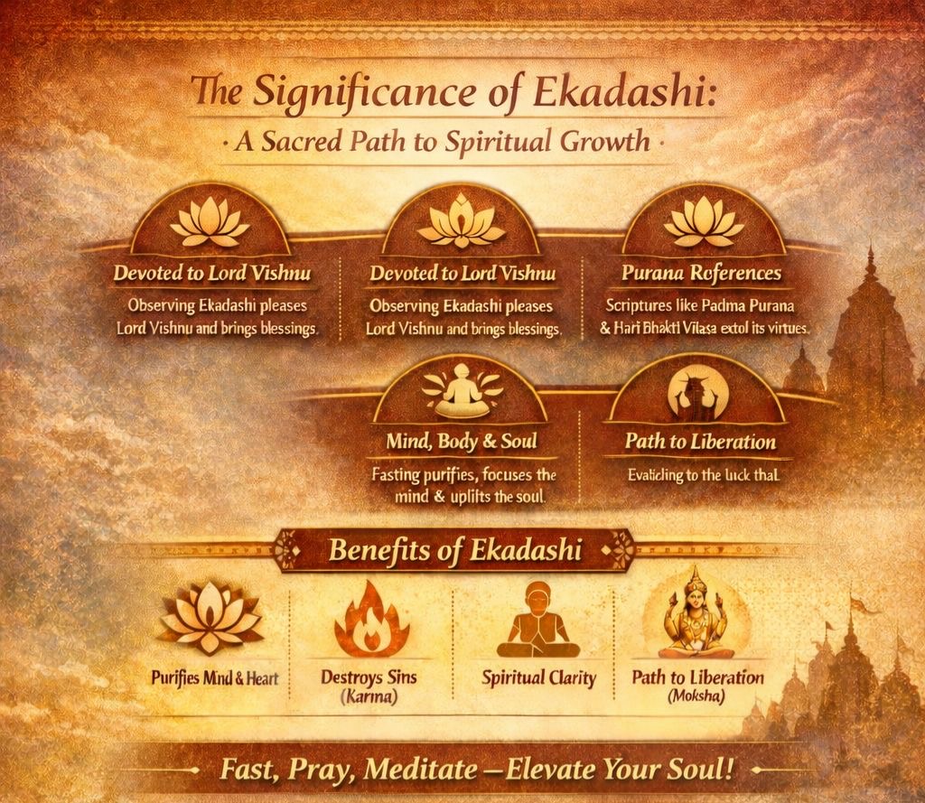 • These scriptures describe Ekadashi as a vrata (vow) that burns accumulated karma and brings devotees closer to divine consciousness.